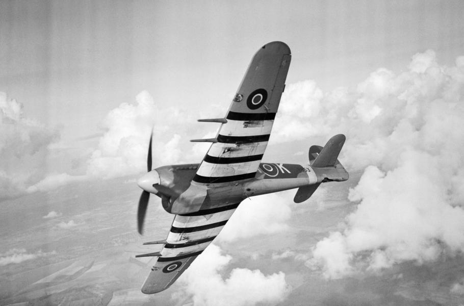 Typhoon Mk.IB patřící k 486. peruti na snímku 27. října 1943. Dobře patrné je identifikační zbarvení na spodní straně křídel. (foto: Wikimedia Commons, Imperial War MuseumsStanley Arthur Devon, IWM Non Commercial Licence)