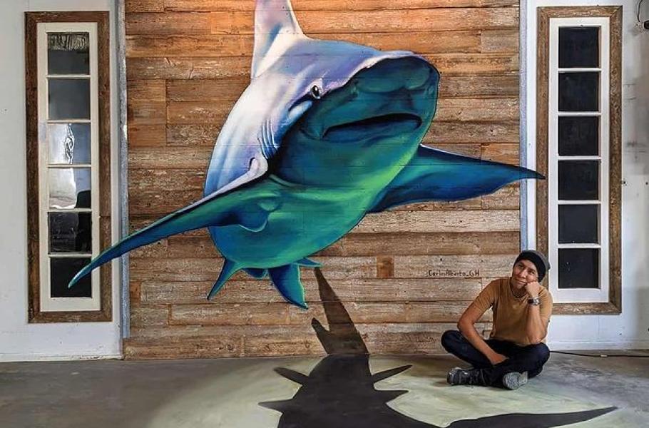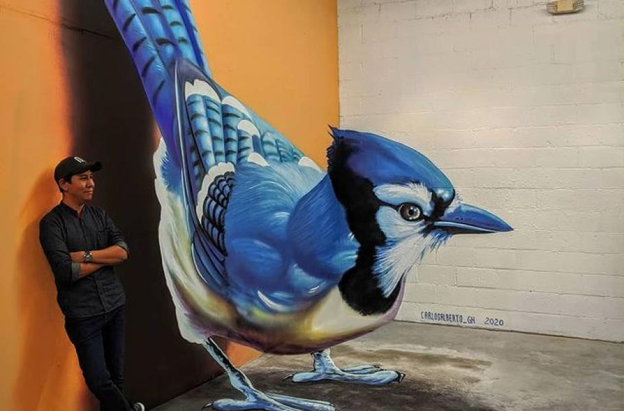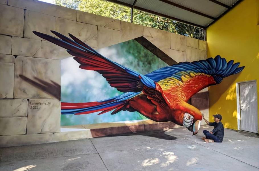 Na obrazech Carlose Alberta zdánlivě vystupují ze zdi realističtí ptáci, plazi nebo třeba obří žraloci. Na snímku papušek Ara arakanga vytvořený v mexickém Palenque, u příležitosti vyhlášení záchranného programu pro tento druh papoušků.