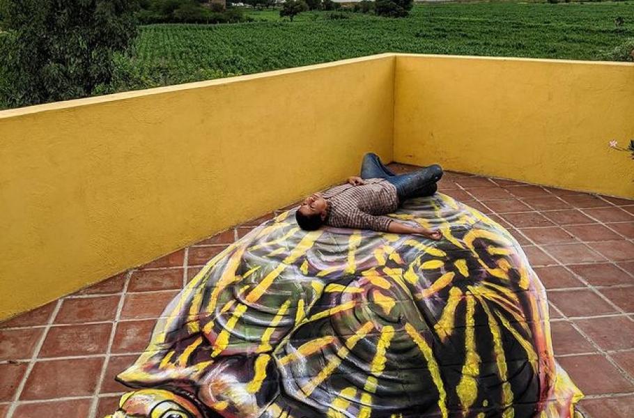 Želva, původně určená pro odložený festival v Tallahassee, na terase v domovské Guadalajaře.
