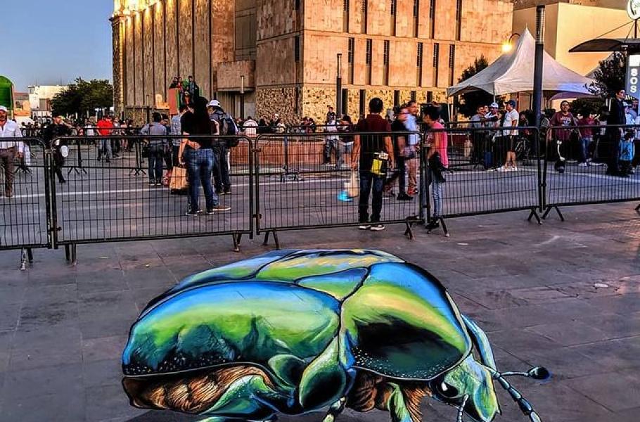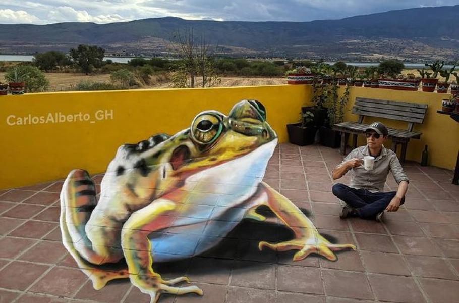 Mexický pouliční umělec Carlos Alberto GH z Guadalajary vytváří pomocí barevných kříd anamorfní obrazy v podobě nejrůznějších surrealistických scén. Jeho obrazy pak ožívají při pohledu ze správného úhlu