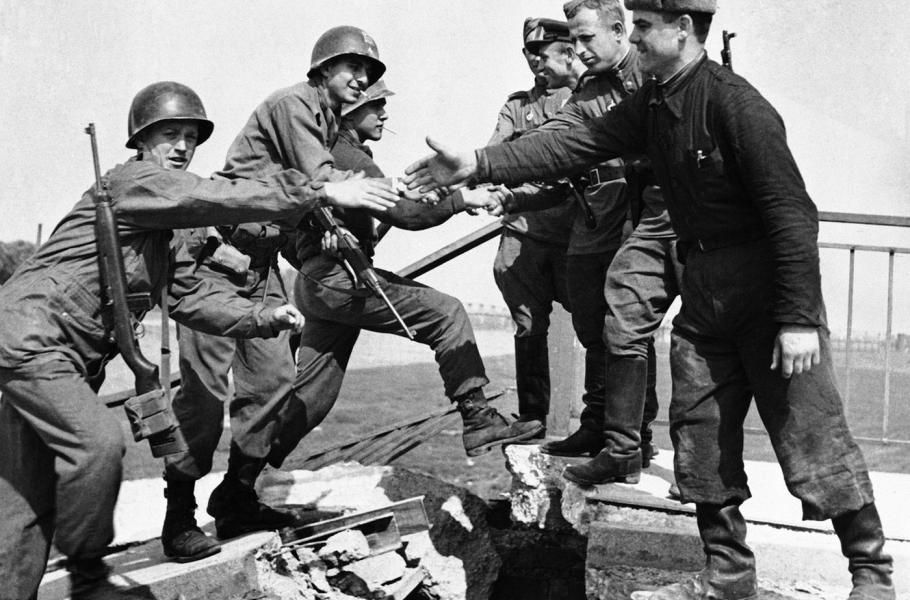 Známý snímek, na kterém si příslušníci 69. pěší divize a 58. gardové střelecké divize podávají ruce na zničeném