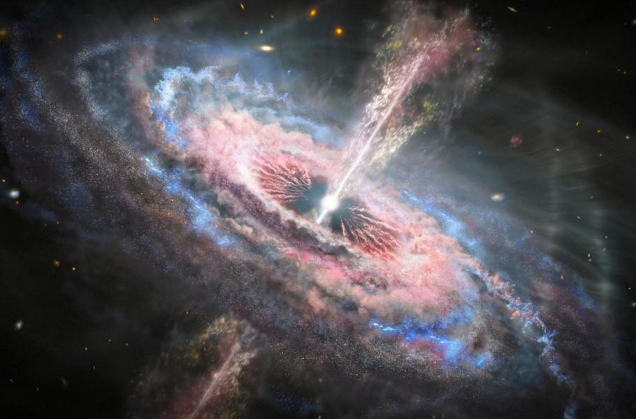 Kvazar je supermasivní černá díra v nitru mladé galaxie, která hýří aktivitou. (ilustrace: NASA, ESA and J. Olmsted (STScI), CC BY-SA 4.0)