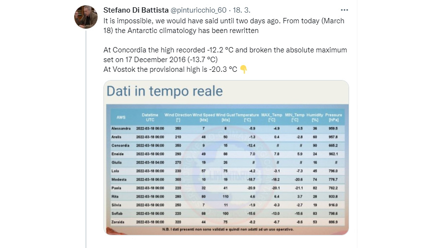 Na antarktické stanici Concordia ležící přes 3 000 metrů nad mořem v pátek teplota dosáhla -12,2 stupně, zatímco na ještě výše položené stanici Vostok naměřili -17,7 stupně Celsia. V absolutním hledisku to jsou sice teploty velmi nízké, na stejných místech ale běžně v březnu, tedy na začátku podzimu, nebývá tepleji než minus 50 nebo minus 60. Di Battista sdělil, že na stanici Vostok se teplota mezi březnem a říjnem nikdy nedostala nad -30.