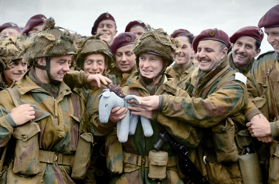 Britští výsadkáři z 22. samostatné výsadkové roty 6. výsadkové divize se svým maskotem na kolorované fotografii.