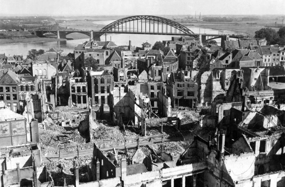 Město Nijmegen po skončení těžkých bojů v září 1944. V pozadí železniční most přes rameno Rýna jménem Waal.