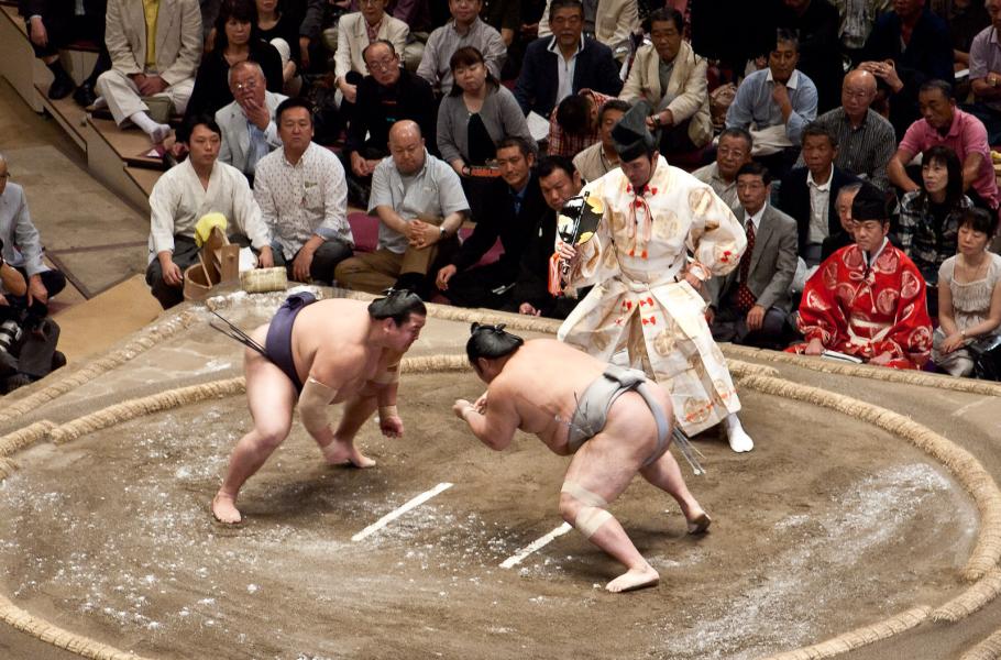 Vítězem klání je ten, kdo protivníka přiměje dotknout se země jakoukoliv jinou částí těla než chodidly nebo jej vytlačí z kruhu. (foto: Wikimedia Commons, Gusjer, CC BY 2.0)