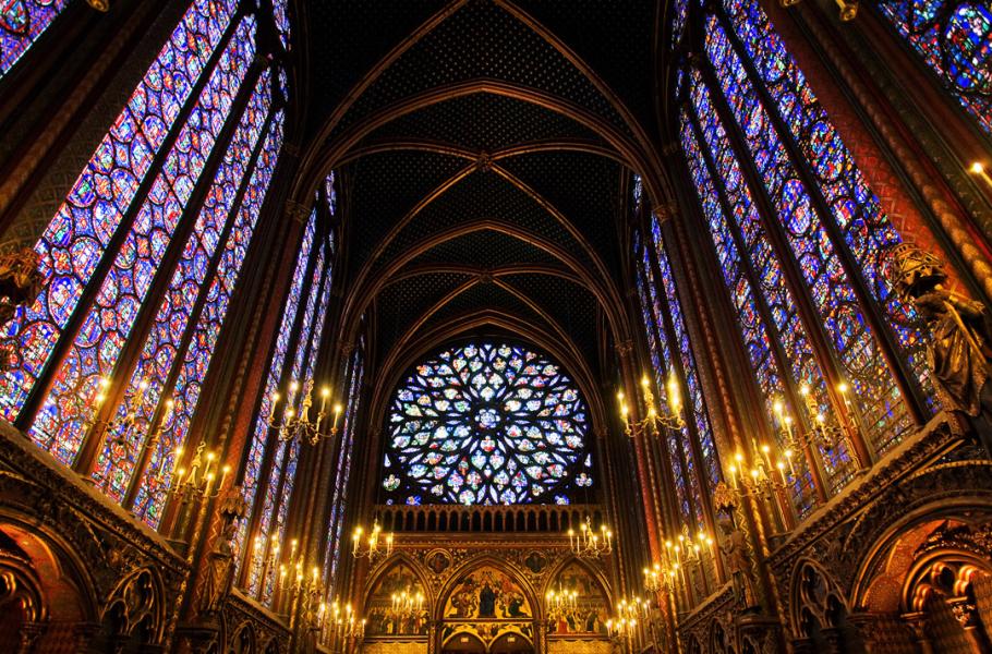 Čelo hlavní lodi Sainte-Chapelle v Paříži. Jedna z nejkrásnějších vitráží na světě.