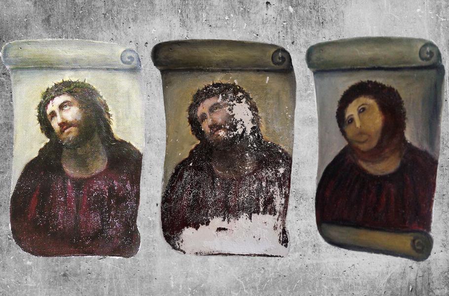 Freska Ecce homo, kterou v kostelíku nedaleko španělské Zaragozy před více než sto lety vytvořil Elías García Martínez, postupně „opadávala“ vinou vlhkosti. Ministerstvo kultury ji sice hodlalo nechat zrestaurovat, ale v porovnání s tamní důchodkyní Cecilií Giménezovou jednalo příliš pomalu: Vitální osmdesátnice vzala dílo do vlastních rukou a pohřbila historickou malbu pod nánosy nové barvy. Výsledek jejího snažení připomíná mazanici malého dítěte, které si hraje s pastelkami. Památku sice původně čekala oprava, ale z poničeného Ježíše se stala internetová senzace a do města kvůli němu proudí davy turistů – takže zatím zůstává ve zbídačeném stavu.