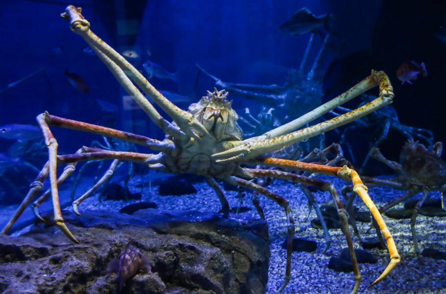 Kolem japonských břehů žije v hloubkách až 600 metrů největší pozemský členovec, velekrab japonský. Na první pohled zaujme velmi dlouhými končetinami, jejichž rozpětí může přesahovat 3,5 metru. Jeho tělo dorůstá maximálně 40 cm a celkově může vážit i 20 kg. Ačkoliv jeho klepeta působí děsivě, pro člověka zmíněný všežravec konzumující rostlinnou i živočišnou stravu neznamená nebezpečí. (foto: Shutterstock)
