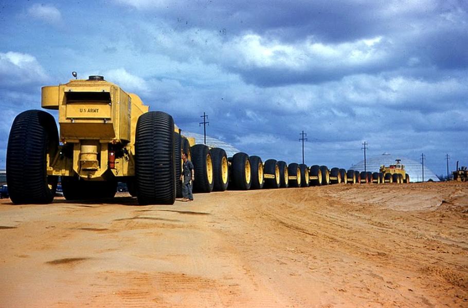 Obří terénní vozidlo se zrodilo v hlavě geniálního amerického vynálezce Roberta Gilmoura LeTourneaua. Délkou i provozním řešením připomíná vlak a jeho základní myšlenka vychází z lokomotivy, která díky dieselelektrickým generátorům produkuje dost energie na uvedení zbylé části soupravy do pohybu. Netřeba dodávat, že zkonstruování takového kolosu nebylo snadné, nicméně v roce 1958 konečně vznikla zcela funkční verze TC-497: poháněly ji čtyři turbínové motory s celkovým výkonem 4 680 koní, její kola měřila 3 m v průměru a celá souprava dosahovala úctyhodných 170 m. V „lokomotivě“ dokonce zbylo místo pro ubikaci, v níž mohlo žít až šest zaměstnanců. Maximální rychlost kolosu ovšem činila pouhých 32 km/h.