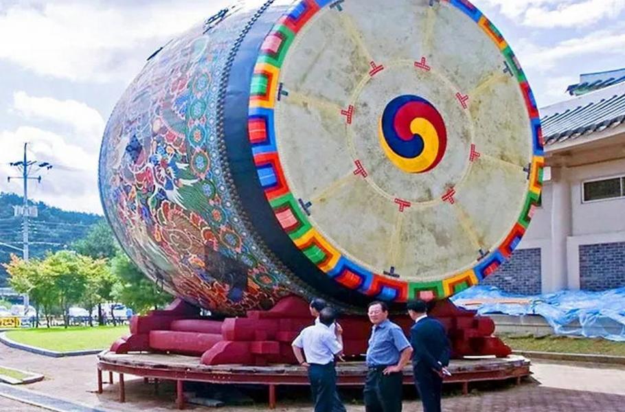 Zápis do Guinnessovy knihy rekordů si vysloužil tradiční zdobený buben zvaný Cheongo, který v červnu 2011 vyrobil Seuk Je Lee a několik členů místní samosprávy v okrese Yeongdong v jihokorejské provincii Chungbuk. Gigant váží sedm tun, měří 5,54 metru a blána napjatá přes horní obruč má ještě o 42 centimetrů větší průměr. (foto: Profimedia)