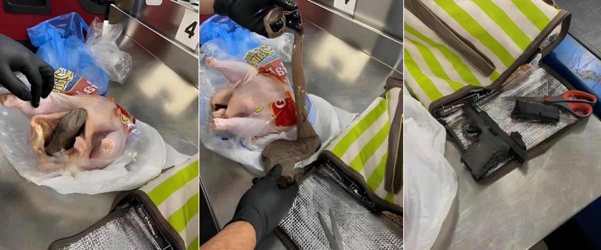 Jistý muž z Floridy se pokusil obojí spojit a zbraň v pytlíku omotaném lepicí páskou nacpal do chlazeného kuřete. Kontrola na letišti Fort Lauderdale-Hollywood však na jeho „zlepšovák“ přišla a nebezpečný kontraband nekompromisně zabavila.