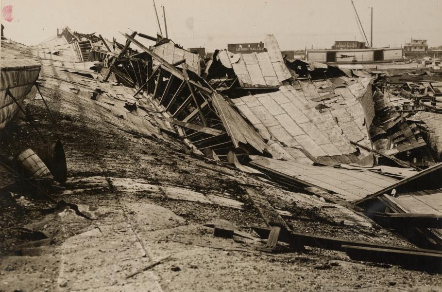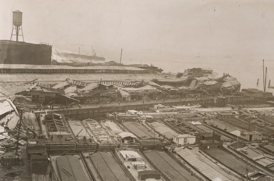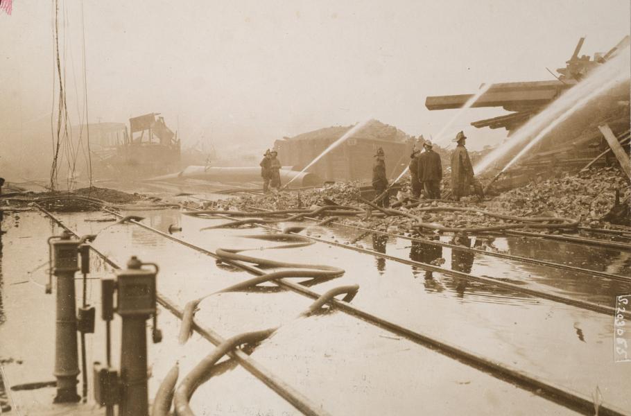 Výbuch muničních skladů na ostrově Black Tom zničil mimo jiné 100 vagonů naložených municí. (foto: Wikimedia Commons, NARA, PDM 1.0)