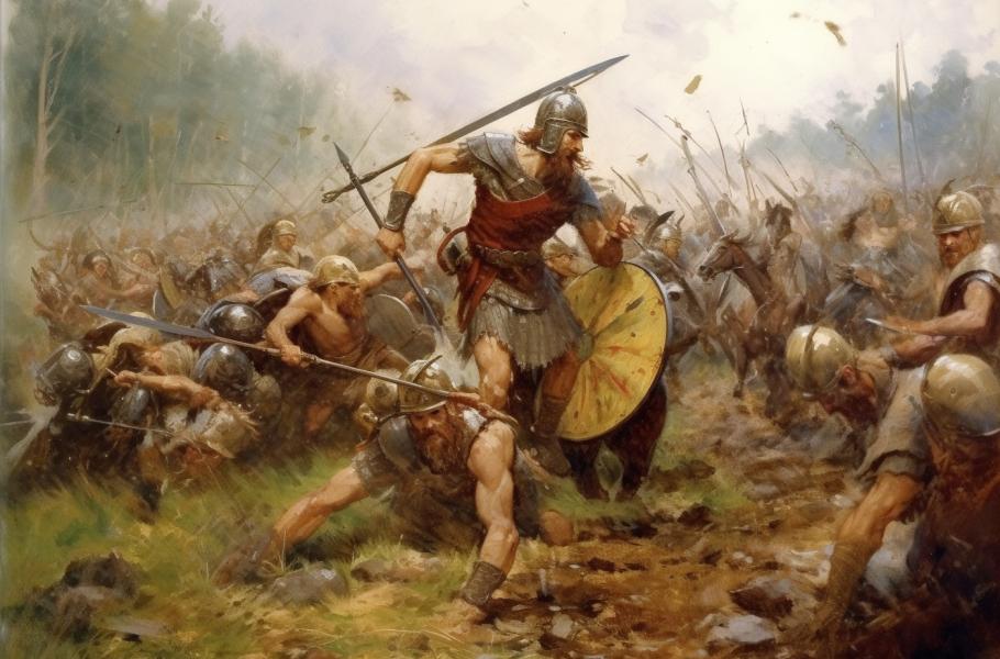 Bitva v Teutoburském lese byla jednou z největších a nejdrtivějších římských porážek v historii. Zanikly během ní tři římské legie. (ilustrace: Midjourney AI, PDM 1.0)