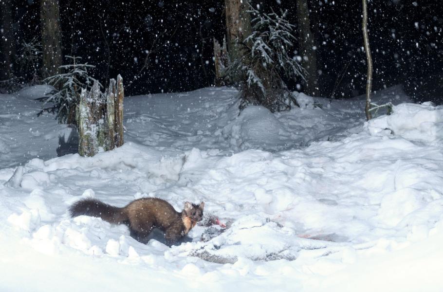 Jednu zimu jsem dostal echo o čerstvém „strhu“ mladé srny s možností umístit na místo činu jednu z pastiček. Nabídky jsem samozřejmě s radostí využil, přestože lokalita nebyla v tomto období nijak snadno dostupná. Na první pohled šlo o úlovek rysa a já doufal, že se v následujících dnech ke kořisti vrátí. K mému zklamání se o pár dní později ukázalo, že se právoplatný majitel srnčího už nevrátil. Jiný predátor, a to kuna lesní, se ovšem na kořisti přišel přiživit hned několikrát. (foto: Vladimír Čech ml. - se souhlsem k publikování)