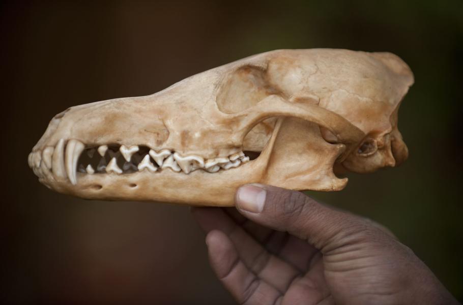 Při následující konzumaci záleží na velikosti úlovku. Větší kořist šelma opakovaně přehazuje v úzkých čelistech a polyká po částech. Menší úlovek pak zhltne vcelku. Dobrému uchopení kořisti nenapomáhá jen prodloužená čelist, ale i rozmístění premolárů (třenových zubů). Ty nejsou, na rozdíl od chrupu většiny ostatních psovitých šelem, umístěny těsně vedle sebe, ale mají mezi sebou větší mezery.
