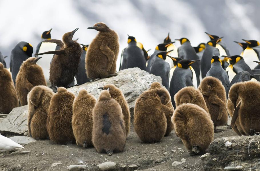 Tučňáci patagonští a jejich dosud nevybarvená mláďata, která po 3–4 měsících intenzivního krmení dosáhnou váhy 10–12 kilogramů.