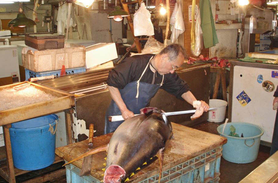 Nejrušněji je na rybím trhu Tsukidži v Tokiu ráno. Už v pět hodin totiž začíná aukce tuňáků. O nejlepší kousky se skoro pokaždé strhne boj a není se čemu divit – prodávají tady ty nejlepší tuňáky v Japonsku a možná i v celé Asii a na světě. Zákazníci zmrzlé ryby prohlížejí a nakukují do řezů, protože při výběru je nutná opatrnost. Kvalitní tuňák tu může vyjít až na desetitisíce korun – jenže nabízené kusy váží okolo pěti set kilogramů. Překvapující, že? Kdo by to do masové drti, kterou u nás koupíte v konzervě, řekl.