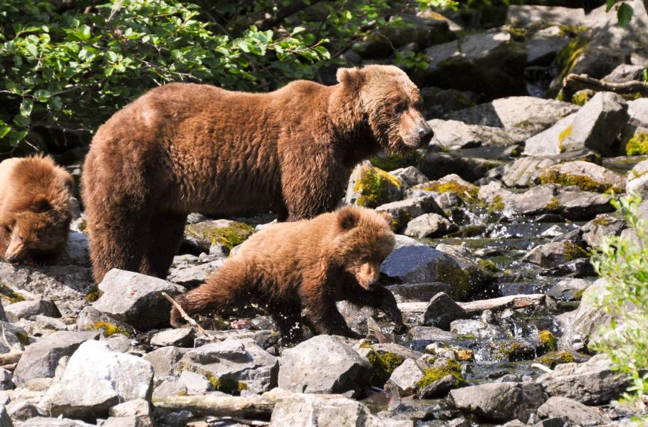 Od místních lovců jsem dostal echo, že dobrá příležitost pro pozorování medvědů bude u řeky Russian na poloostrově Kenai. Hned druhý den jsem se tam vypravil. K řece jsem se dostal okolo půlnoci. V letním období je naštěstí na Aljašce pořád světlo a já viděl, že břeh je plný rybářů. Pro mnohé z nich je tah lososů jedinečnou příležitostí, a tak se činí a tahají z vody jednu rybu za druhou. Mnozí z ní však vyříznou jen filety a kostru s hlavou lososa hážou zpět do vody. Nechtěně tak lákají medvědy, kteří se s vidinou snadného nasycení stahují právě do těchto míst. Toto pravidlo se mi brzy potvrdilo, když jsem zpozoroval, jak se mezi rybáři prochází medvěd černý (Ursus americanus americanus) a hoduje na zbytcích. Tohle už každopádně nebyla vhodná doba na focení, a tak jsem se rozhodl najít místo na spaní a ráno se k řece vrátit.