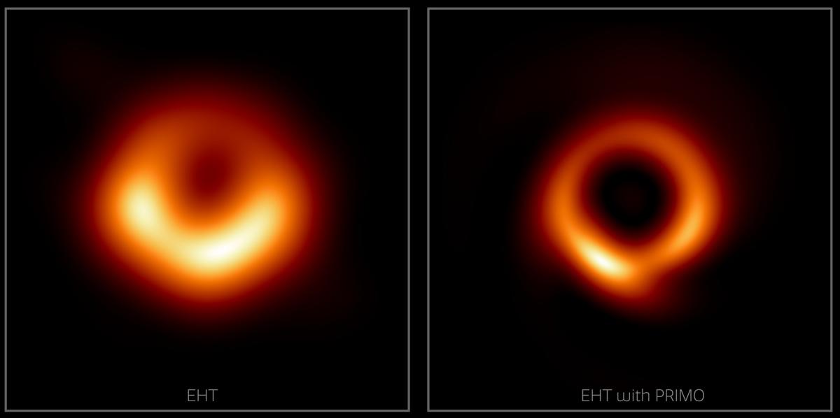 Vlevo původní snímek supermasivní černé díry M87*, vpravo snímek vylepšený inteligencí PRIMO.