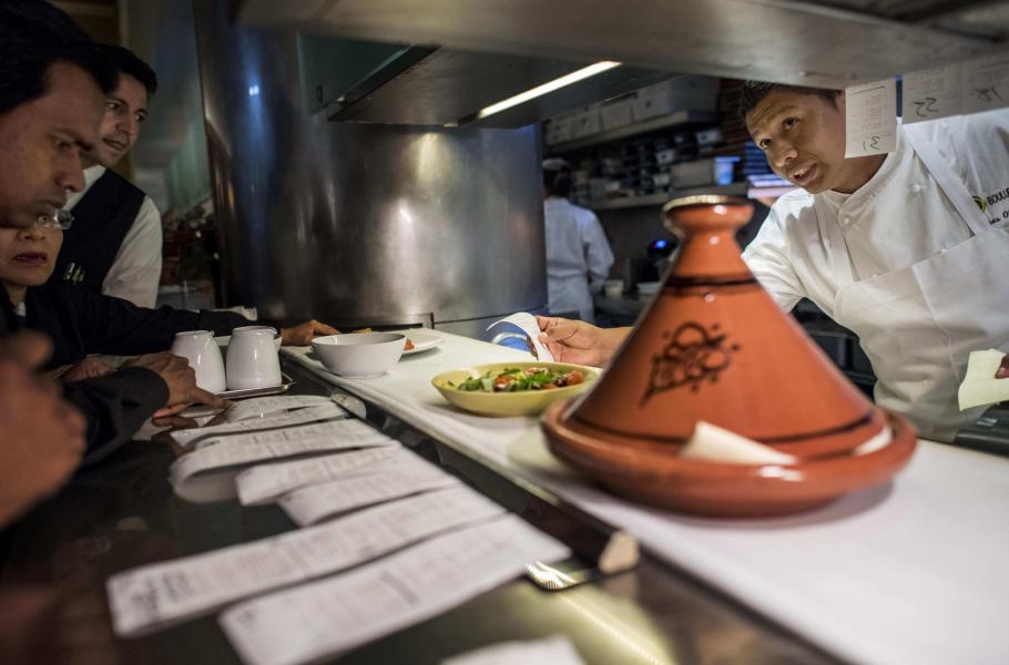 Když ostříknu dřevěné prkýnko s oranžovým flekem, všichni okolo mě náhle s křikem odskočí, oči plné slz. V duchu si dělám poznámku: Pokud člověk prskne horkou vodu na zbytky oleje z papriček habanero, vyrobí tím slzný plyn. Poznámka číslo dvě: Všechno se tu dělá pořádně. Opláchnu mísu a ukazuju ji svému mentorovi. Kývne hlavou, ale nádoba neputuje do police, nýbrž ještě do myčky. Natlačím do ní celý regál nádobí, který pak půl minuty ostřikuje proud sedmdesátistupňové vody s odmašťovačem. Tedy většinou. Když dovnitř nacpu velké krájecí prkno, celá ta věc se zasekne a kolegové mi musejí pomoct otevřít ocelový poklop, abych mohl zavazející kus nádobí vytáhnout.