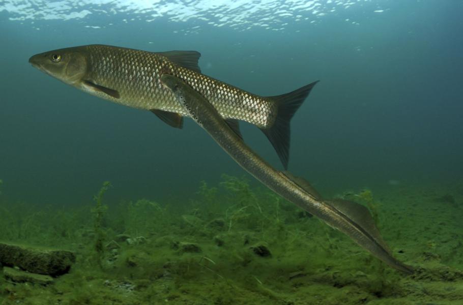 Mihule říční (Lampetra fluviatilis) přisátá na parmu obecnou portugalskou (Luciobarbus bocagei).