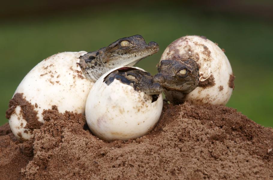 Jakmile se mláďata uvnitř vajec domluví, události naberou rychlý spád a během deseti minut jsou všechna mláďata venku ze skořápky. Pokřik mláďat z nitra vajec je přitom určen i jejich matce. Ta na něj reaguje tím, že z hnízda opatrně odstraní svrchní vrstvy hlíny, písku a shnilé vegetace. Usnadní tak mláďatům jejich hlasitě avizovaný příchod na svět. Bez její pomoci by mláďata právě vyklubaná z vajec byla zaživa pohřbena.