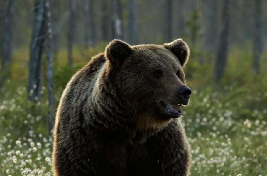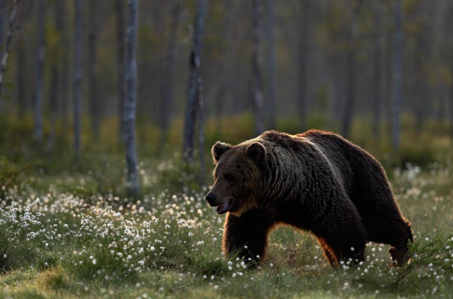 Ani tahle návštěva ovšem nebyla pro tuto noc posledním setkáním. S prvními paprsky slunce se totiž objevil dospělý temně hnědý samec, který chodil ve stopách medvědice. Světla bylo mnohem víc, paprsky nádherně prosvětlovaly medvědí kožich a suchopýry se v trávě rozzářily. Právě tehdy jsme zažili medvědí přítomnost na nejmenší vzdálenost. Velký samec se k nám dostal na asi 7–8 metrů a upřeně koukal naším směrem. V ten moment jsem si poprvé uvědomil, o jak impozantní zvíře se doopravdy jedná.