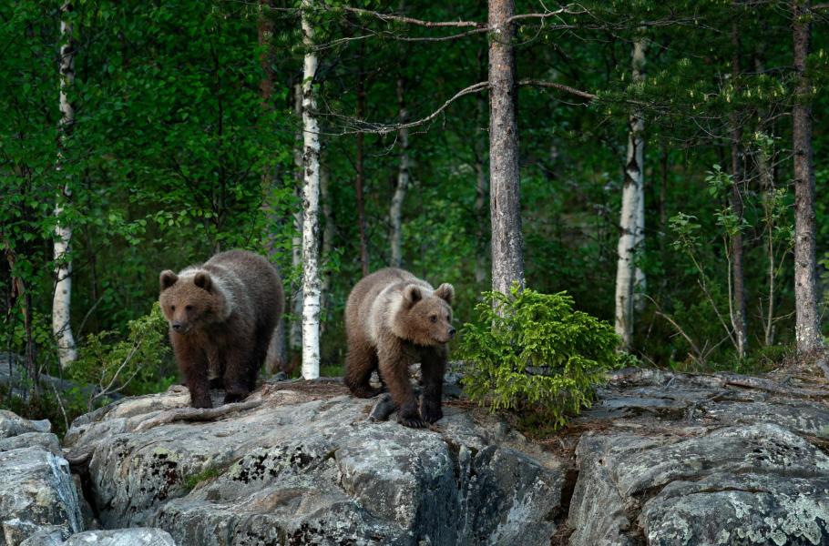 Z příchodu medvědice jsem byl nadšený. První noc v krytu a hned přijde medvěd! To jsem ještě netušil, co se bude dít za hodinu. Když bylo severské letní šero největší, medvědice se vrátila a doprovázela ji dvě asi rok a půl stará medvíďata. Mláďata byla občas těsně u samice, ale někdy se zapomněla a pak mámu rychle dobíhala. Malí medvědi byli mnohem tmavší než medvědice a okolo krku měli výraznou pásku světlé srsti. Neustále pobíhali okolo, občas se schovali do trávy nebo za kmeny mladých borovic. Celá medvědí přehlídka trvala skoro pět minut.