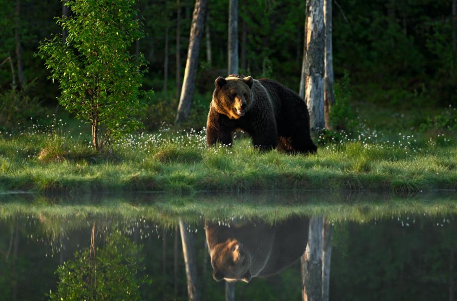 Při rozjímání nad krásou severské přírody to krátce před půlnoci přišlo. Tedy, abych byl přesnější, přišla. Z pravé strany si to po okraji jezírka štrádovala samice medvěda hnědého (Ursus arctos). Vykukovala za suchopýrem a se skloněnou hlavou pomalu přicházela po břehu k nám. Jen když se na chvilku zastavila, zvedla hlavu a podívala se okolo sebe. Její převrácený obraz byl vidět v tmavé noční hladině jezírka. Důstojná medvědí dáma se před našimi zraky promenovala čtyři minuty a po okruhu okolo jezírka opět zalezla do lesa.
