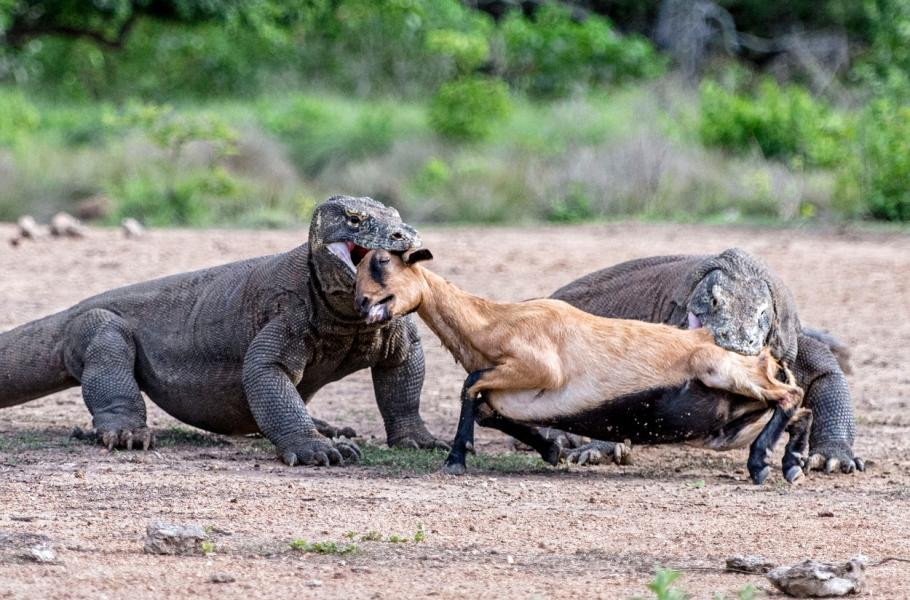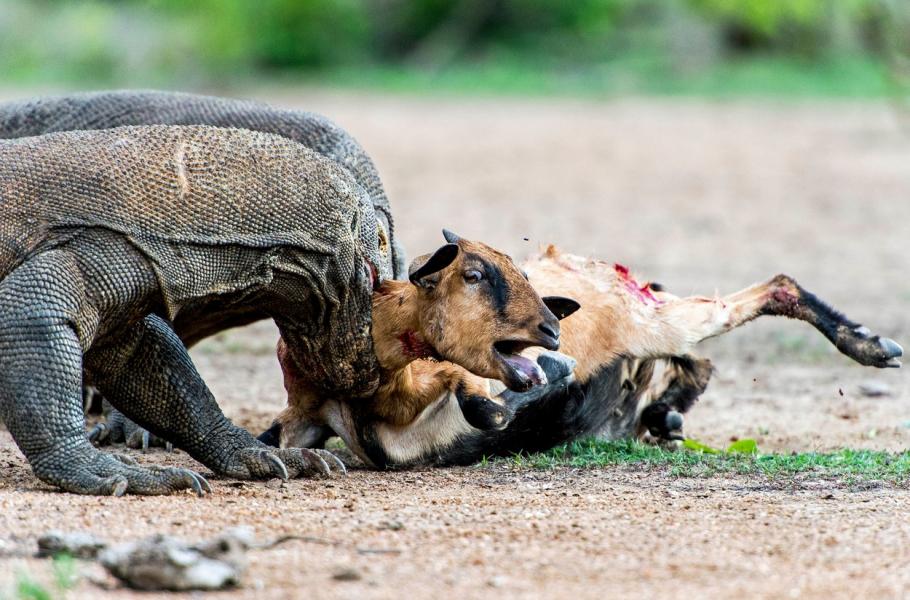 Dvojice varanů z indonéského národního parku Komodo, nedala své kořisti sebemenší šanci. (foto: Profimedia (Julie Sunduková)