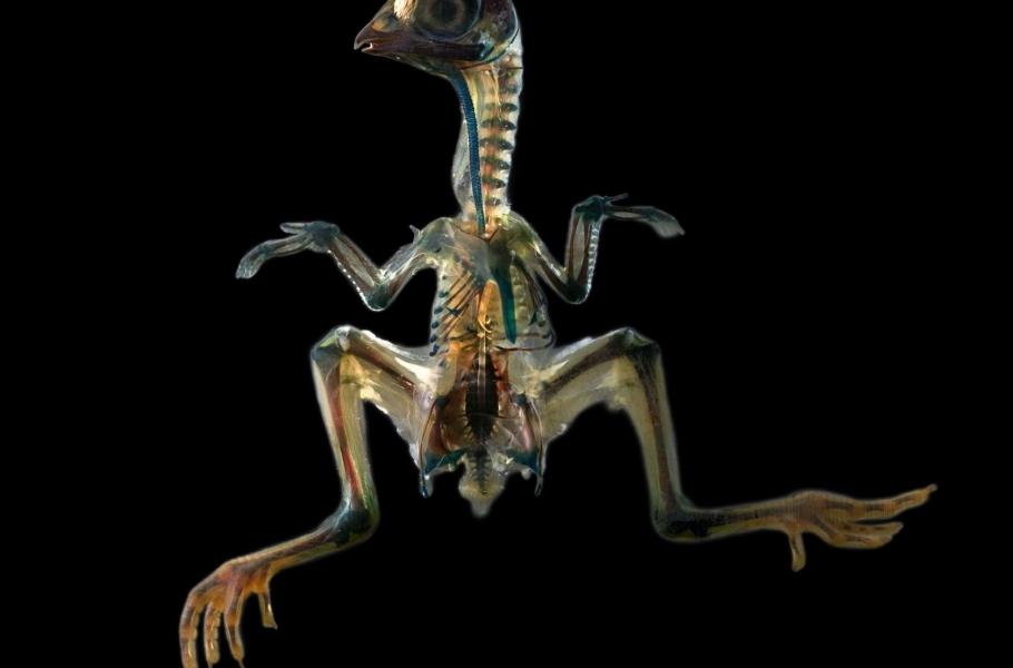Preparát kuřete s obarvenými chrupavkami sloužil jako studijní pomůcka a pochází ze sbírek anatomického ústavu 1. LF UK. Fotografie byla pořízena s použitím protisvětla a byly z ní odstraněny rušivé části nesouvisející s objektem.