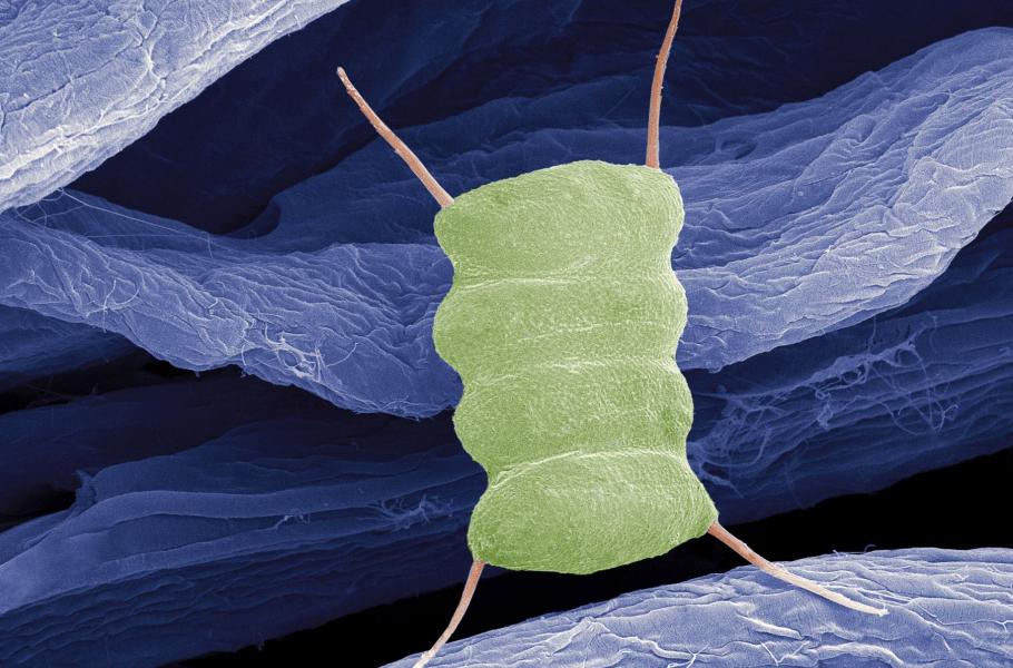 Řasa druhu Scenedesmus quadricauda se používá jako modelový organismus například při testování toxicity vod. Snímek pochází ze skenovacího elektronového mikroskopu a je „dobarven“ pomocí Adobe Photoshopu.