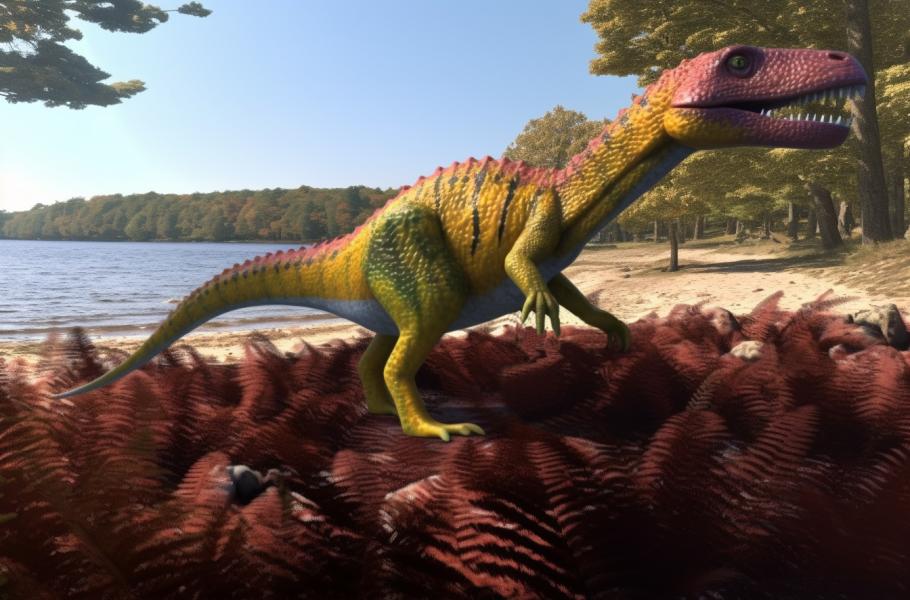 Velký dravý dinosaurus z příbuzenstva spinosaura Protathlitis cinctorrensis žil u dnešního pobřeží Španělska ve spodní křídě, před 127-126 miliony let. (ilustrace: Midjourney AI, CC0)