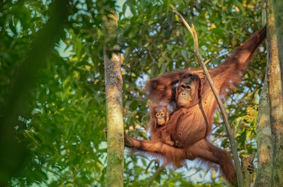 Mláďata orangutanů jsou podobně nesoběstačná jako děti. Jejich narození proto předchází dlouhá a pečlivá příprava, která zahrnuje i budování „hnízda“ ve stromech, ve výšce až třiceti metrů. Jeho konstrukce přitom počítá s těhotenským přírůstkem hmotnosti a je natolik hustá, aby skrz ni potomek nemohl propadnout. Samice rodí jednou za šest až sedm let a většinou jen jediné mládě. Potomek je na ní zcela závislý a setrvává v její blízkosti zhruba do deseti roků. (foto: Shutterstock)