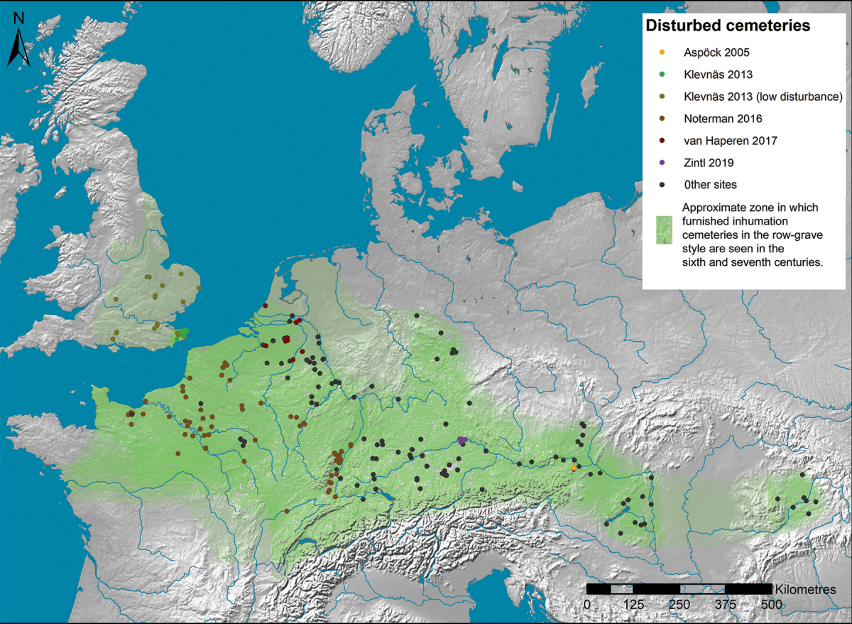 Mapa raně středověkých pohřebišť, na kterých bylo zaznamenáno znovuotevření hrobů.