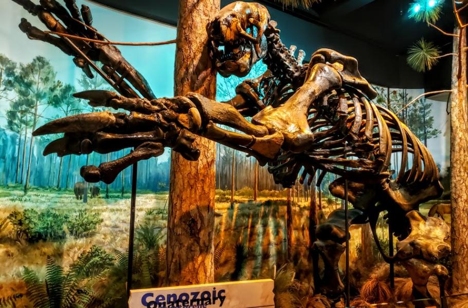 Fosilie obřího pozemního lenochoda Eremotherium eomigrans v expozici NC Museum of Natural Sciences