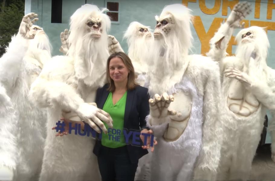 Přibližně desítka podivných stvoření v maskách a bílých kožešinách byla k vidění tento týden v ulicích New Yorku. Yettiové neboli sněžní muži si dali dostaveníčko na Flatiron Plaza a dalších místech New Yorku. Ulicemi města se proháněli v doubledeckeru, metrem a navštívili i místní sportovní utkání.