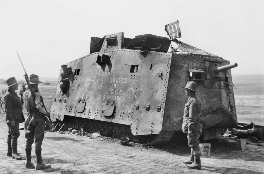 Německý tank A7V ukořistěný 26. australským praporem v Monument Wood poblíž Villers-Bretonneux ve Francii 14. července 1918. (foto: Wikimedia Commons, neznámý autor, CC0)