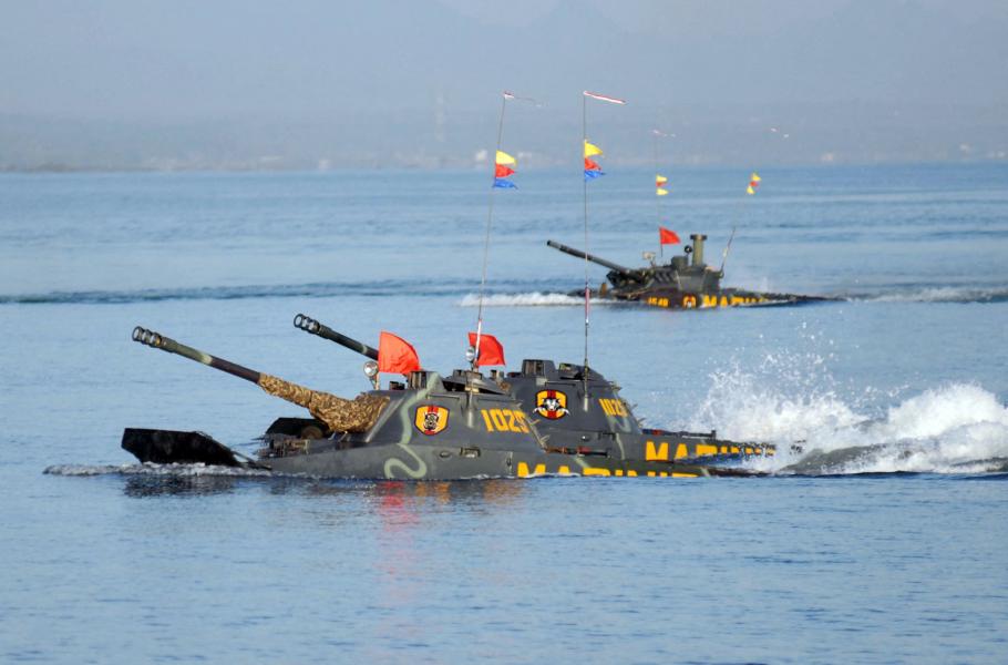 Snímek z 13. května 2014 zachytil dva tanky PT-76(M) při nácviku vylodění na pláži Banongan na východě Jávy. Za nimi pluje bojové vozidlo pěchoty BMP-3F. (foto: Profimedia)