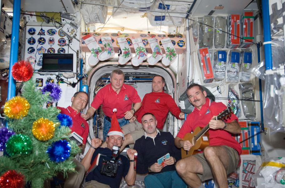 Sovětská propaganda vánočním svátkům moc nepřála, a tak se na stanicích Saljut či Mir formálně neslavily. Dnes je ovšem na Mezinárodní kosmické stanici situace jiná: k dispozici je jak umělý vánoční stromeček, tak tradiční ponožky (nesmíme zapomínat, že každá země slaví vánoční svátky jinak). Nechybí pohlednice od rodiny (dopravované zásobovacími loděmi), drobné dárečky nebo tradiční jídla (krocan s bramborovou kaší a brusinkovou omáčkou). A také speciální příděl „vánočních pochutin“ – oříšků, čokolády apod.