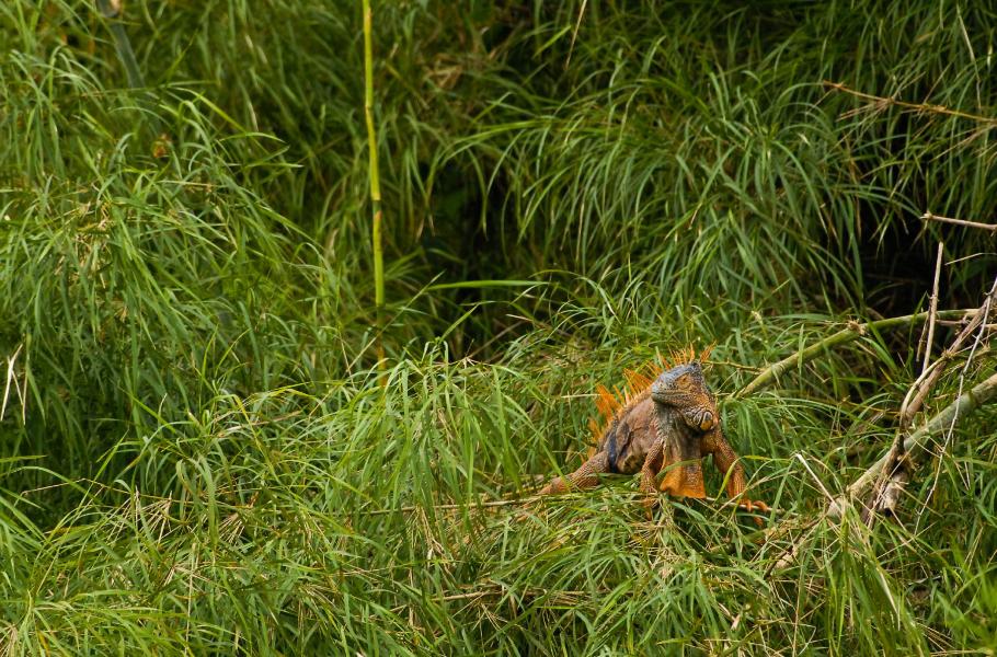 Leguáni zelení (Iguana iguana) patří k nejatraktivnějším plazům Střední a Jižní Ameriky a včetně ocasu dorůstají až dvou metrů. Krátká setkání na cestě po Kostarice a Ekvádoru jsem si bohatě vynahradil v Belize. Seděl jsem pod mohutnými stromy lemujícími řeku a sledoval lovící volavku bělostnou. Náhle nade mnou začaly praskat větve, několik jich prosvištělo vzduchem a dopadly kousek přede mě do řeky. K mému úžasu se mezi nimi objevil i plachtící leguán, který s plesknutím zmizel pod hladinou řeky a po chvíli se vynořil na druhém břehu. Byl to statný cihlově zbarvený samec. Potupně lezl zpět do korun stromů, kde se nachází i jeho potrava – listí.