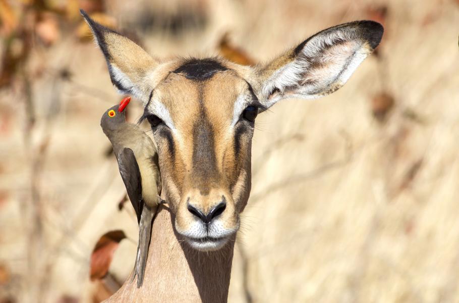 Klubáka červenozobého lze v subsaharské Africe nejčastěji spatřit na tělech velkých sudokopytníků, včetně antilop impal. Nevyužívá je však ke svezení, ale vyzobává jim ze srsti parazity: Dospělý pták denně spořádá sto klíšťat nebo přes dvanáct tisíc larev. Chutná mu ovšem i krev, takže když nějakého škůdce vyklovne, nezřídka pak udržuje ránu otevřenou a dopřává si rovněž životodárnou tekutinu. Ve srovnání s otravností parazitů jsou nicméně drobné ranky zanedbatelné, tudíž opeřenci poněkud drastičtější jednání prochází. (foto: Shutterstock)