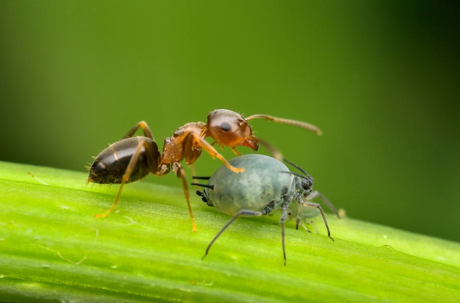 Mšice patří ke známým druhům parazitického hmyzu, který vysává mízu z těl rostlin. Květiny i plodiny jimi bývají doslova poseté, přičemž se mezi zmíněnými škůdci nezřídka pohybují také mravenci. Ti však mšice překvapivě neloví, nýbrž využívají ve svůj prospěch: Malí paraziti totiž vylučují velmi sladkou látku zvanou medovice, z níž mravenci čerpají živiny. Vztah popsaných druhů je proto výhodný pro obě strany – odměnou za obranu před predátory je potrava. (foto: Shutterstock)