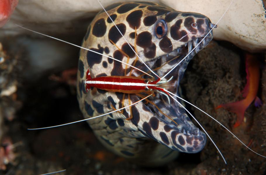 Až čtyřicet metrů pod hladinou tropického oceánu dokáže přežívat krevetka pruhovaná, která působí coby podmořská uklízečka – její potravu tvoří z drtivé většiny odumřelá tkáň a parazité. Tvoreček dorůstající délky pěti až šesti centimetrů prohledává za daným účelem dno nebo také opečovává větší živočichy. Například při očistě murény síťované se krevetka dokonce nebojí vlézt predátorovi do tlamy, a zatímco ten vyhlíží kořist, „údržbářka“ se při péči o něj nasytí. (foto: Shutterstock)