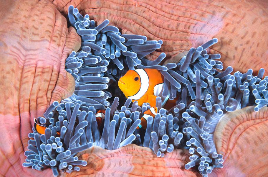 Mořské sasanky chytají své rybí oběti pomocí žahavých chapadel. Klaun očkatý se však s jejich nebezpečnými výběžky naučil pracovat: Velmi jemně se jich dotýká, dokud si vůči jedu nevyvine imunitu, a poté se v objetí sasanky zabydlí. Drobná barevná rybka zůstává mezi chapadly v bezpečí před predátory a zároveň se živí uhynulými výrůstky nebo živočišnými zbytky z okolí. Sasanka na druhou stranu klauna využívá jako pomyslnou návnadu a loví ryby, jež by si na něm chtěly pochutnat. (foto: Shutterstock)