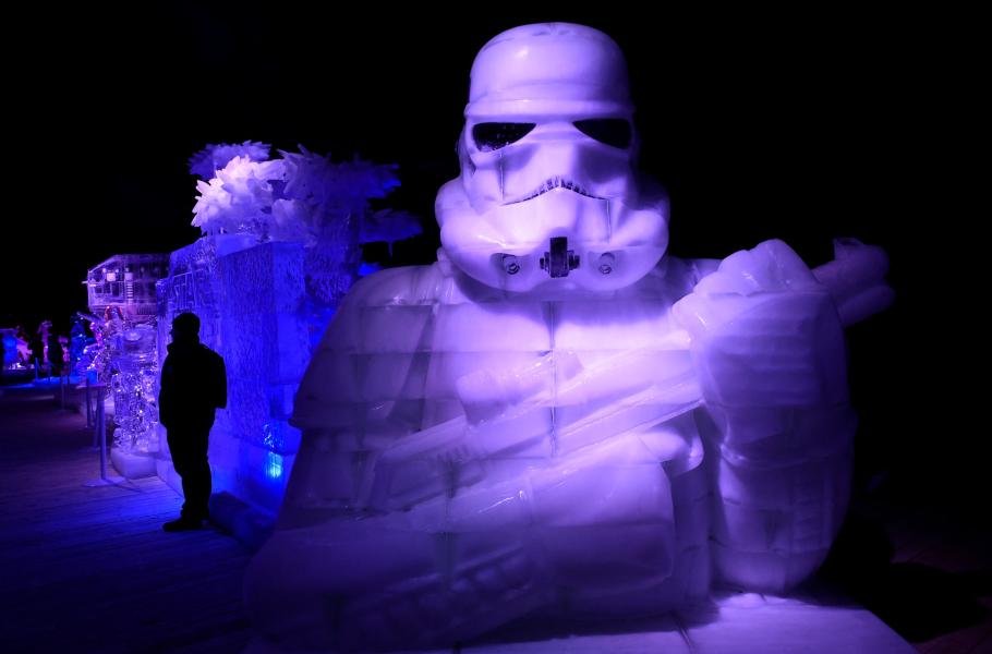U příležitosti uvedení snímku „Star Wars: Síla se probouzí“ do belgických kin se v Lutychu odehrál tematicky laděný festival ledových soch, kde byl mimo jiné k vidění obrovský stormtrooper neboli člen úderné pěchoty. Vedle něj pak samozřejmě nechyběly ani další postavy filmového univerza. (foto: Profimedia)