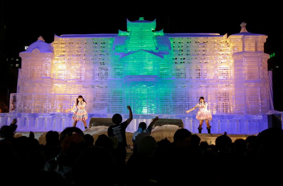 V japonském Sapporu se každý rok koná Festival sněhu a ledu. Ročník 2017 zaujal například barevně nasvícenou napodobeninou historického penzionu Taipei Guest House, před nímž se odehrála také hudební vystoupení. (foto: Profimedia)