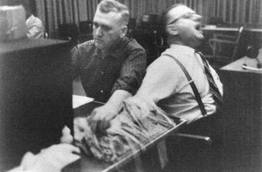 Po zmíněném ospravedlnění mu dokonce neváhali dát i poslední ránu, která ho „zabila“. Při pokusu se neumíralo ani netrpělo doopravdy – v křesle seděl placený herec, jenž bolest předstíral. Dobrovolníci to však nevěděli… (foto: Yale University, CC0)