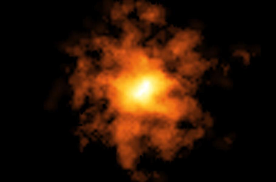 Snímek galaxie REBELS-25 pořízený soustavou ALMA. Na snímku je patrné rozložení chladného plynu a náznaky protáhlé struktury v jejím středu. (foto: ESO/ALMA, Lucie Rowland, CC BY-SA 4.0)